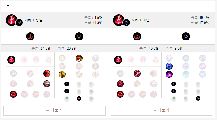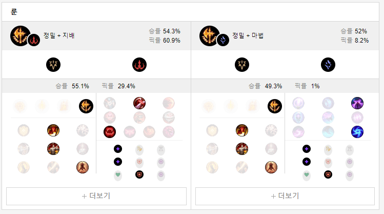 이즈리얼은 정복자, 무효화 구체, 깨달음과 어둠의 수확, 승전보, 최후의 일격으로 두 룬 트리의 픽률이 비슷합니다.